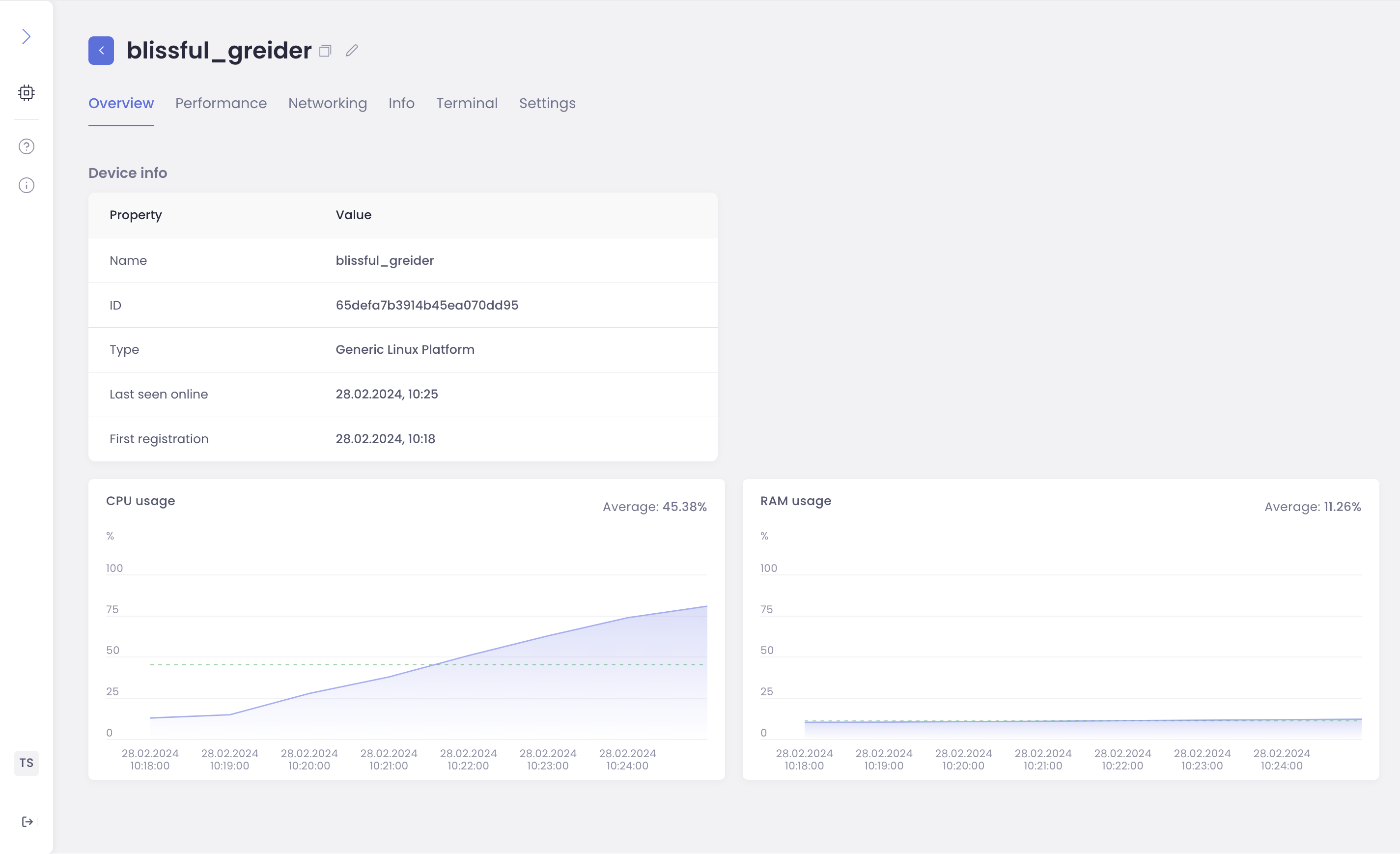 Device info – contains the same information as in the Overview tab with the addition of the hostname listed;